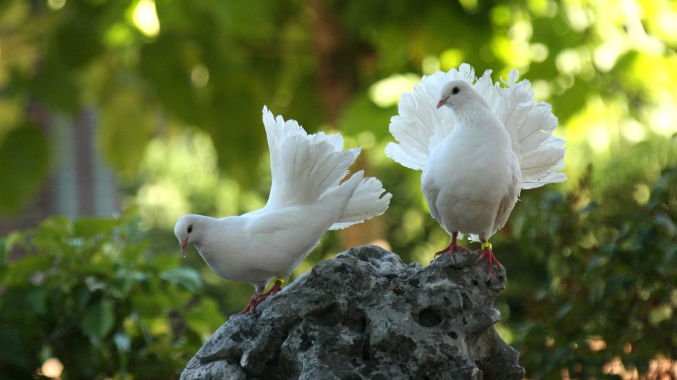 两只白鸽栖息岩石上展翅4K壁纸