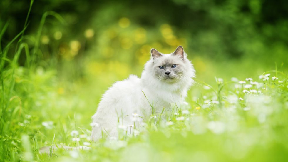 白毛蓝眼猫坐于花丛草地4K壁纸