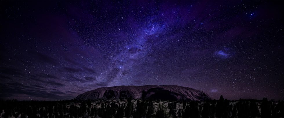 夜空繁星璀璨,银河横跨天际,下方是澳大利亚乌鲁鲁巨岩的剪影,静谧壮丽。