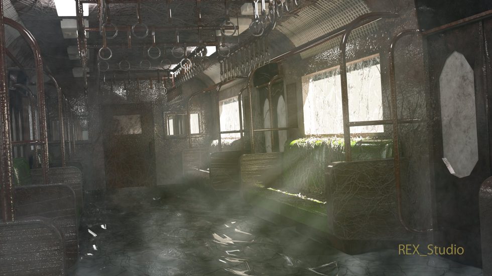 昏暗潮湿的地铁车厢内布满苔藓与积水,金属结构锈蚀,悬挂扶手空荡,透入的光线营造出荒凉末世氛围。