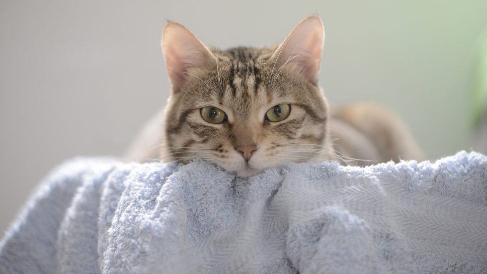 一只虎斑猫趴在浅蓝色毛巾上,绿色眼睛直视镜头,表情平静而专注,背景柔和模糊。