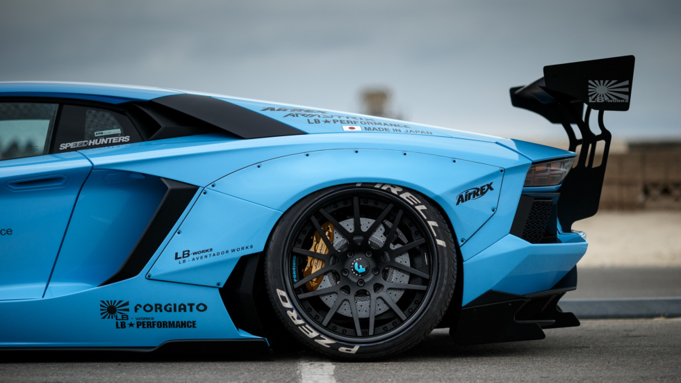 一辆亮蓝色的改装兰博基尼Aventador,配备宽体套件、大尾翼和Forgiato轮毂,车身贴有LB Works等性能品牌标识。