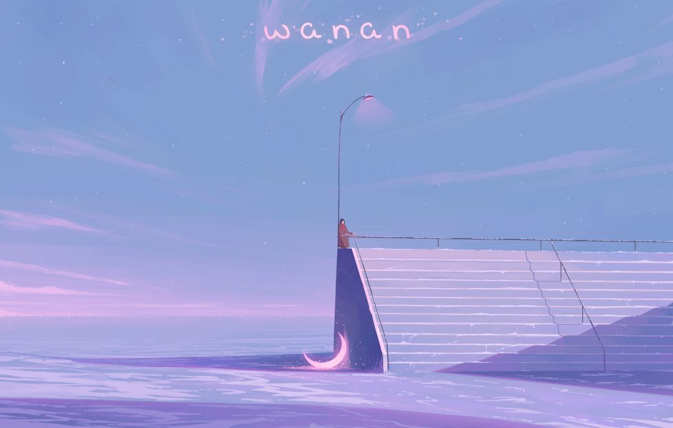 一位人物站在阶梯顶端的灯柱旁,背景是星空与渐变紫蓝天空,地面如水面倒映月牙,氛围静谧而梦幻。