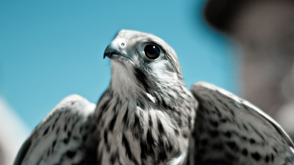 一只羽毛斑驳的猛禽,眼神锐利,背景为蓝色天空,姿态威严而专注。