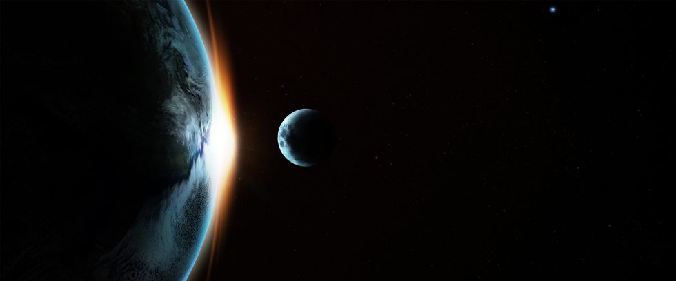 深空背景下,地球边缘被阳光照亮,旁边悬挂着月球,远处点缀着点点星光。